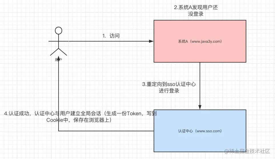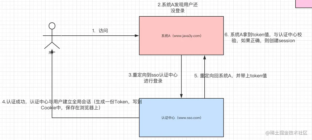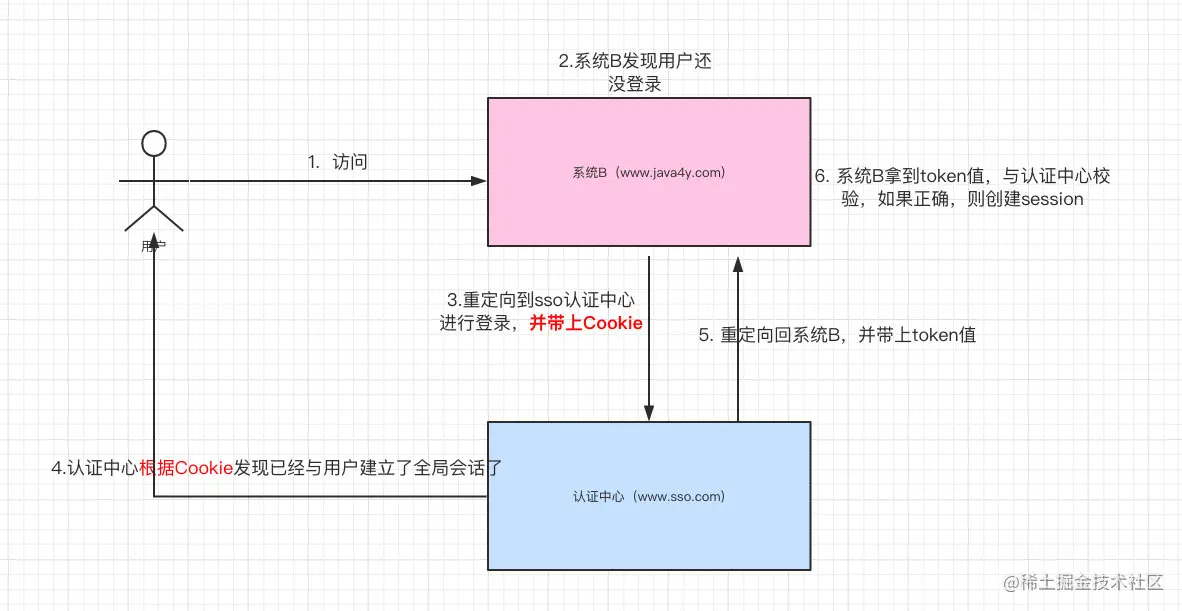 注意,因为之前用户与认证中心www.sso.com注意,因为之前用户与认证中心www.sso.com已经建立了全局会话(当时已经把Cookie保存到浏览器上了),所以这次系统B重定向到认证中心www.sso.com是可以带上Cookie的。