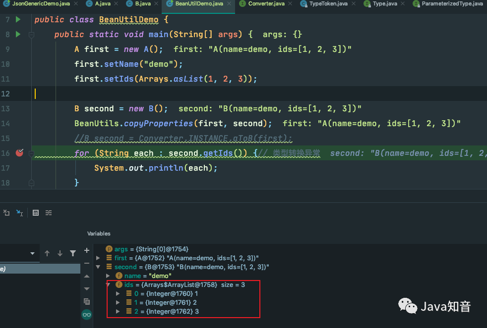 打断点可以看到,属性拷贝之后 B 类型的 second 对象中 ids 仍然为 Integer 类型: