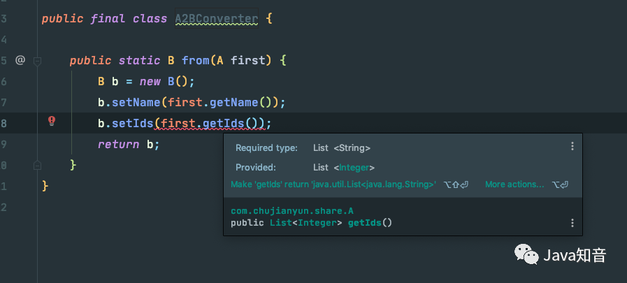 可以成功的将 A 中 List<Integer> 转为 B 中的 List<String> 类型。