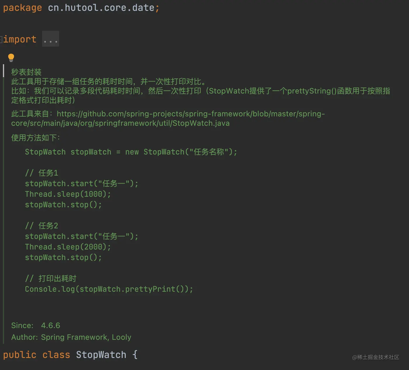 这说明 hutool 的作者也认为 Spring 的 StopWatch 写得好,哈哈哈😁。