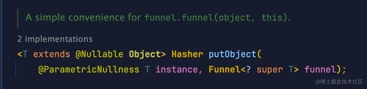Hasher 实现了 PrimitiveSink 接口,这个接口为接受原生类型流的对象定义了 fluent 风格的 API