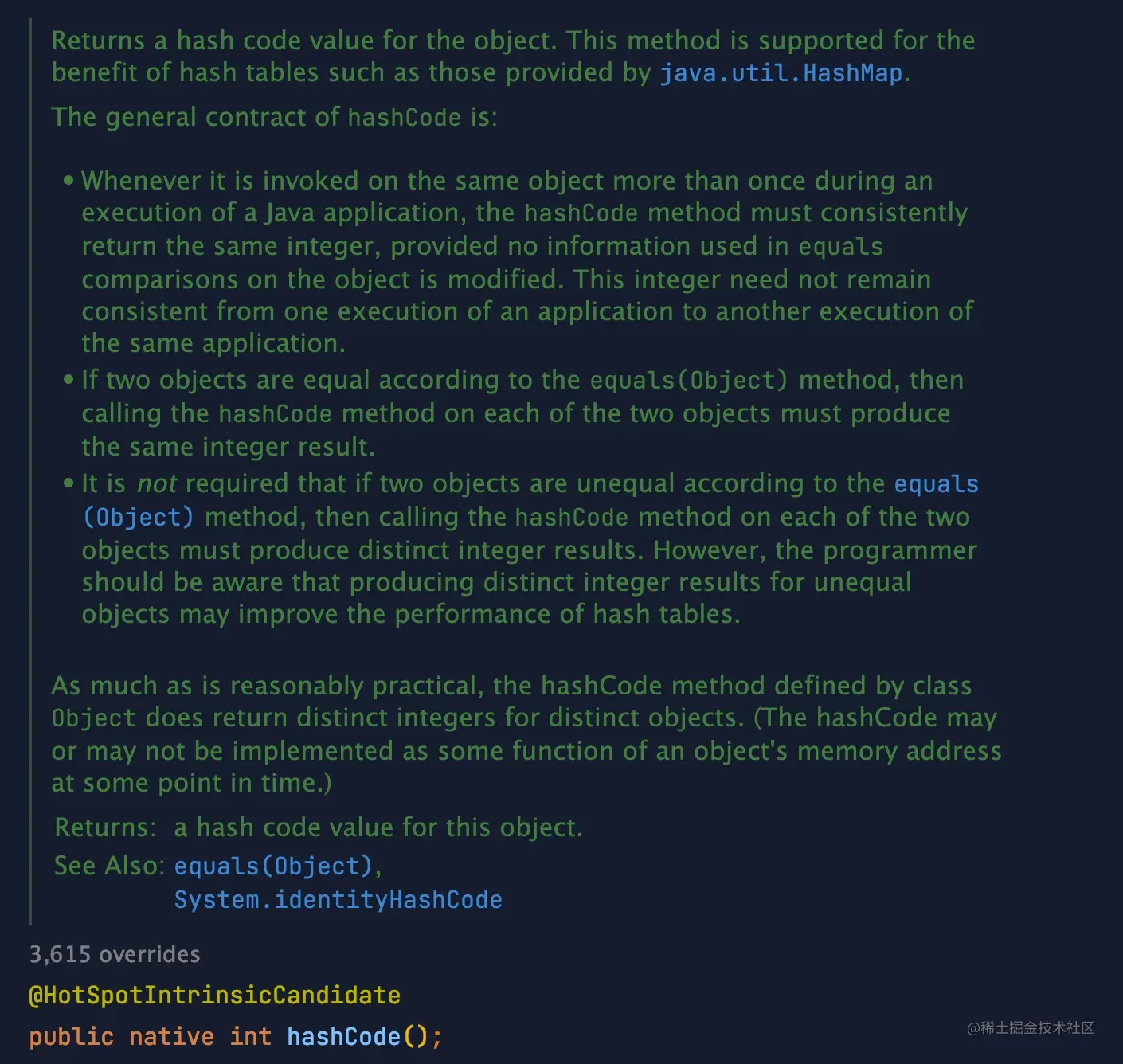 Object.hashCode 往往很快,但是在预防碰撞上却很弱,也没有对分散性的预期。这使得它们很适合在散列表中运用,因为额外碰撞只会带来轻微的性能损失,同时差劲的分散性也可以容易地通过再散列(rehash)来纠正(Java 中所有合理的散列表都用了再散列方法)。然而,在简单散列表以外的散列运用中,Object.hashCode 几乎总是达不到要求——因此,有了com.google.common.hash包。