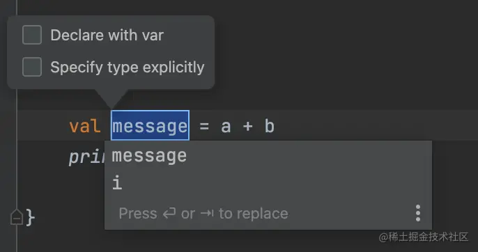 您可以选择的另一件事作为声明顶部的气泡弹出 — 是否使变量不可变(在本例中为 Kotlin var 或 val)以及可能的其他特定于语言的选项,如下面的 Kotlin 屏幕截图所示 — 是否指定类型。
