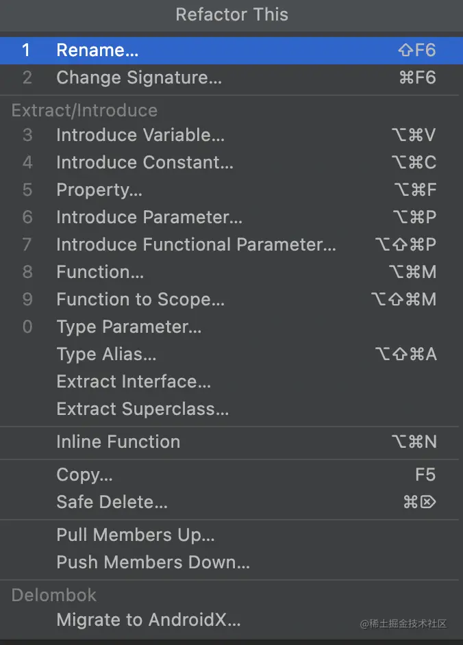 这是一个包罗万象的捷径。如果你不想一下子记住所有的东西,只要先记住这个,其余的就会及时出现。此组合向您显示所有可用的重构选择。所有以前的快捷方式都在这里,因此您可以将其用作起点。
