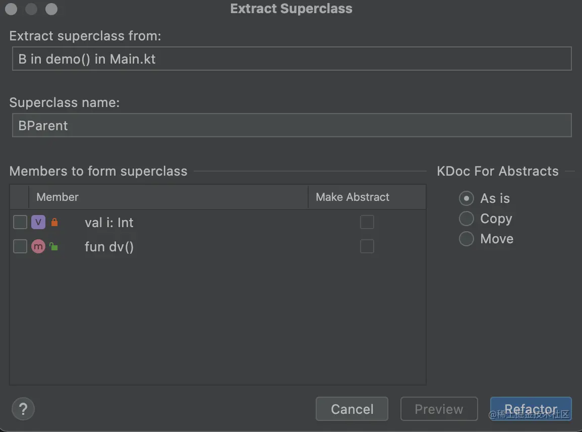 Pull Members Up——将选定的成员(字段或方法)移动到父类Push Members Down— 将选定的成员(字段或方法)移动到子类