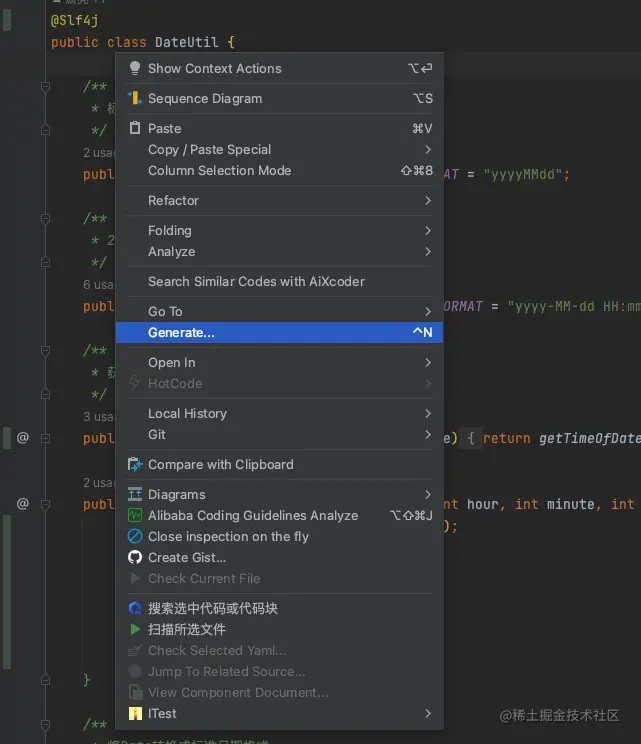 DateUtil类中,我们可以单击鼠标右键,将弹出包含这些选项的菜单。只需单击“Gnerate...”。