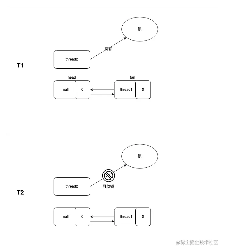 - 在 T1 时刻,thread2 持有锁。thread1 进入第一次循环,获取锁失败,开始执行
