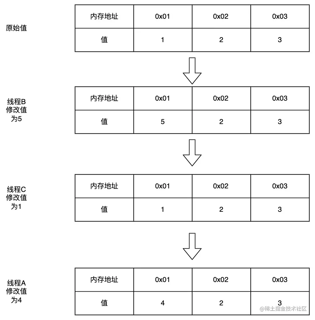 我们假设在内存 0x01 处存放 1,0x02 处存放 2,0x03 处存放 3。现在我们有一个线程 A,它要使用 CAS 操作修改 0x01 处的值为 4。此时,它只需要这样操作即可。