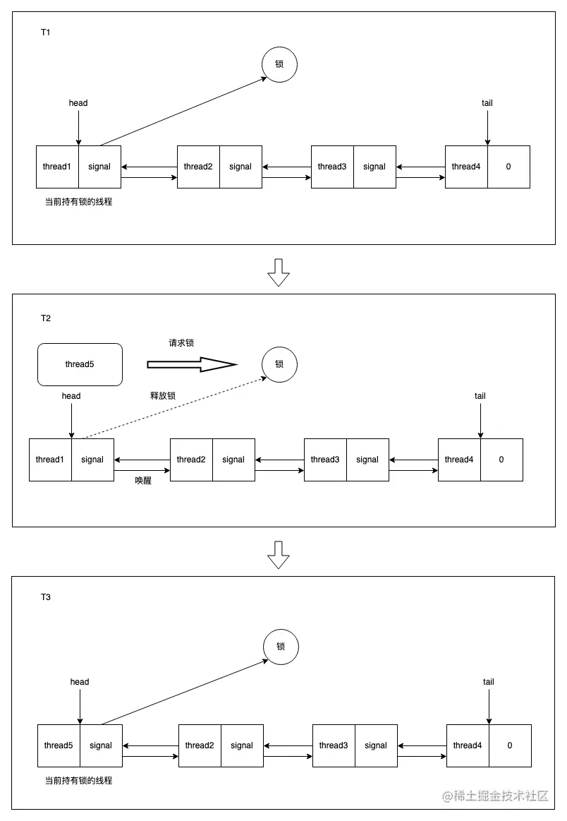 为什么设置了前驱节点的状态为 SIGNAL 后,需要再次循环去尝试获取锁,而不是直接进行阻塞?这里就可以给出解答:如果设置了 SIGNAL 后,直接阻塞的话,thread 1 会无法获取锁。
