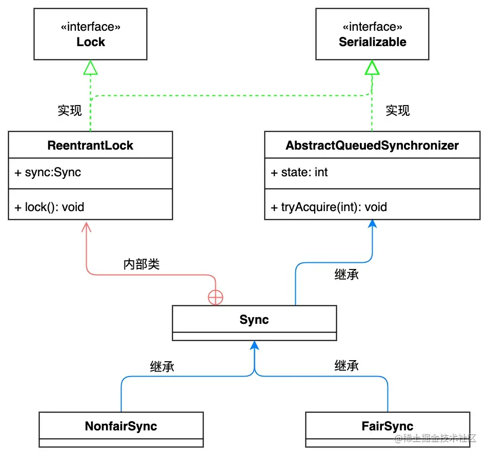 ReentrantLock 并不直接继承 AbstractQueuedSynchronizer 类,而是定义了一个子类 Sync 去继承 AbstractQueuedSynchronizer,让子类去实现同步器。