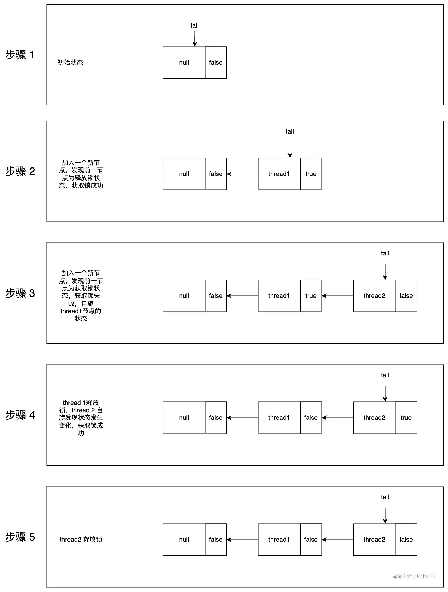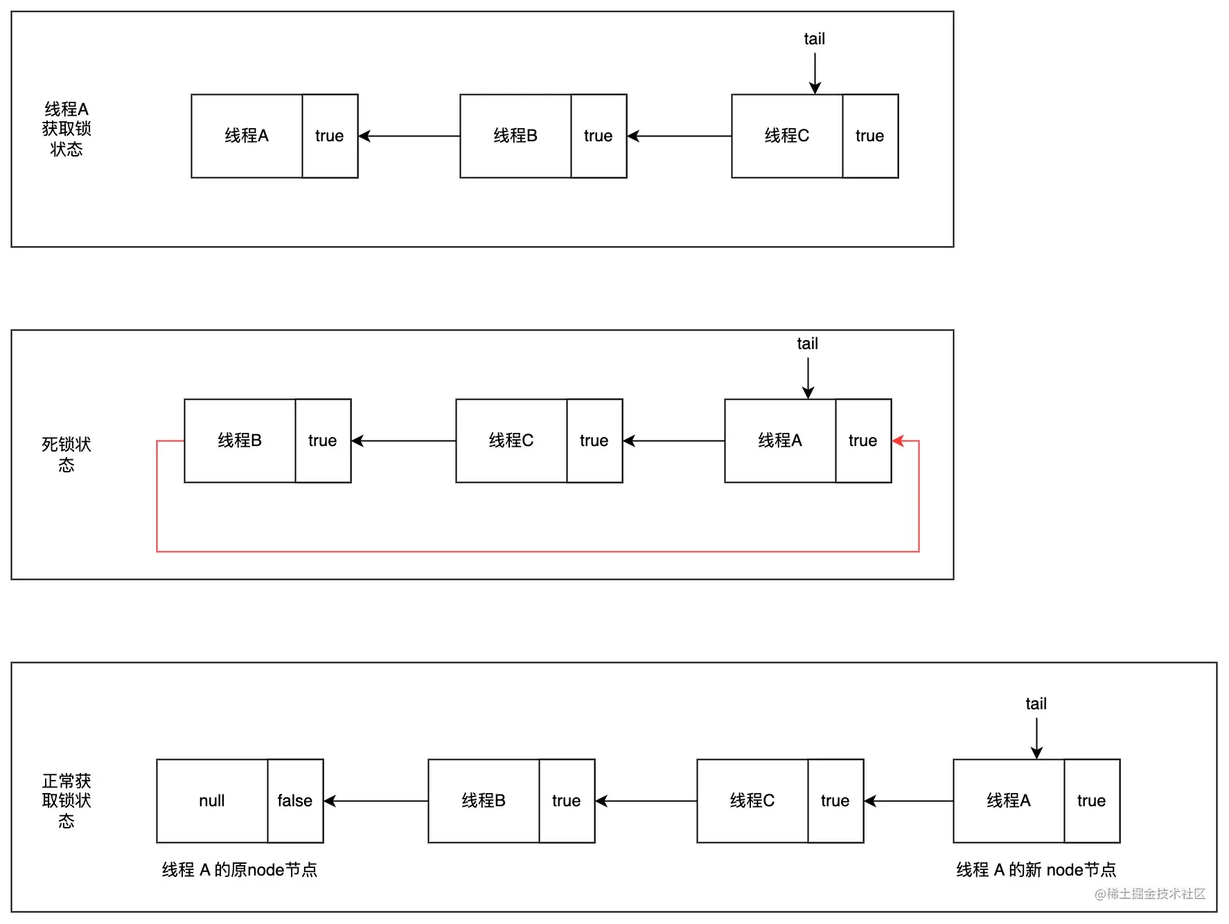 在替换 tail 节点之前,会先设置 node 的前驱节点为当前的 tail 节点。也就是说此时,通过 node 的 pred 指针是可以找到 oldTail 的,但是 oldTail 的 next 指针找不到 node,然后通过 CAS 操作将 tail 指针指向 node。