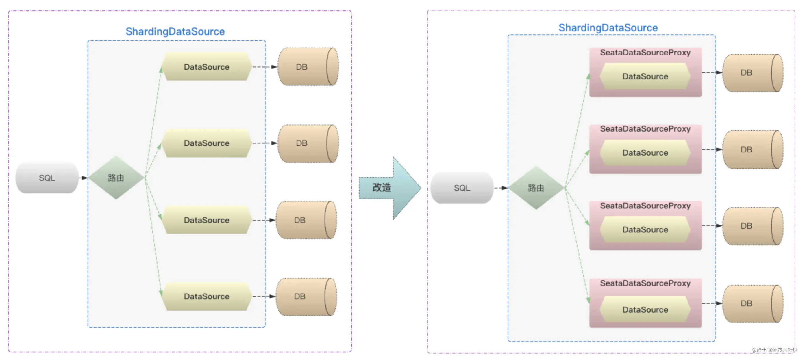 具体如何改造呢?对借鉴业界类似产品如 ShardingSphere ,将其对接 Seata 的实现机制进行梳理分析,即可明确方案:对数据库中间做改造,核心是针对物理 DataSource 做代理,而非逻辑 DataSource,原理如下图:
