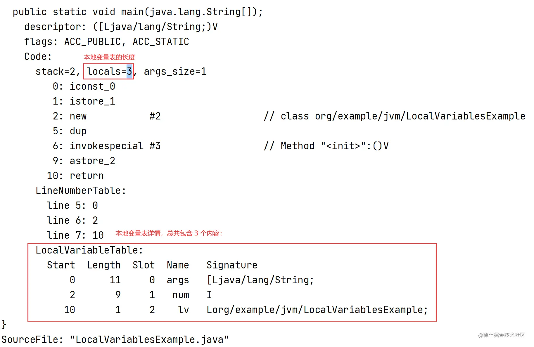 然后我们编译类,再使用“javap -v LocalVariablesExample.class”查看字节码生成的内容,其中包含的本地变量表内容如下: