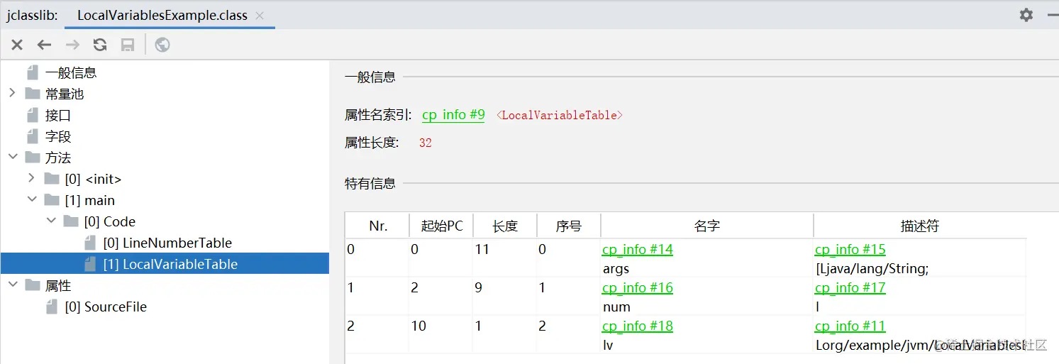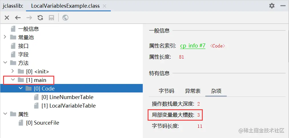 我们通过 JClassLib 也能观察到局部变量表的信息,如下图所示为局部变量表的长度: