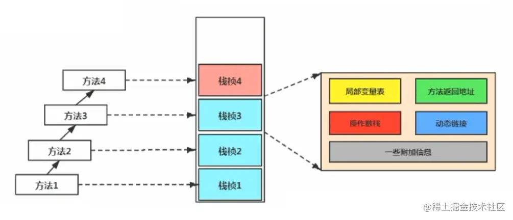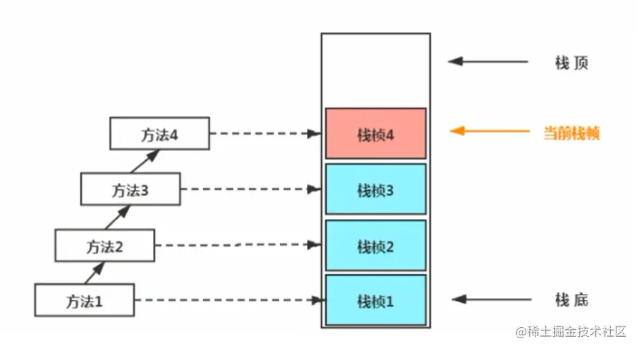 PS:当一个新的方法被调用时,就会在栈中创建一个栈帧,当方法调用完成之后,也就意味着这个栈帧会执行出栈操作。