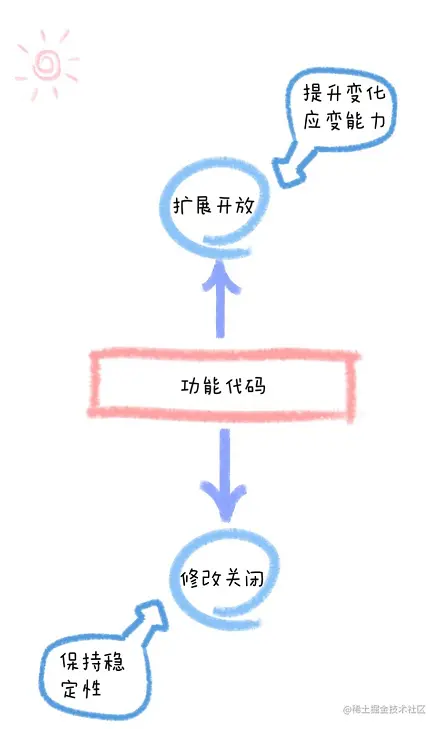 设计原则中所说的修改指的是对原有代码的修改,而扩展指的是在原有代码基础上的能力的扩展,并不修改原先已有的代码。这是修改与扩展的最大的区别,一个需要修改原来的代码逻辑,另一个不修改。因此才叫对修改关闭但是对扩展开放。弄清楚修改和扩展的区别之后,我们再想一想为什么要对修改关闭,而要对扩展开放呢? 我们都知道软件平台都是不断进行更新迭代的,因此我们需要不断在原先的代码中进行开发。那么就会涉及到一个问题如果我们的代码设计的不好,扩展性不强,那么每次进行功能迭代的时候都会修改原先已有的代码,有修改就有可能引入bug,造成系统平台的不稳定。因此我们为了平台的稳定性,需要对修改关闭。但是我们要添加新的功能怎么办呢?那就是通过扩展的方式来进行,因此需要实现对扩展开放。