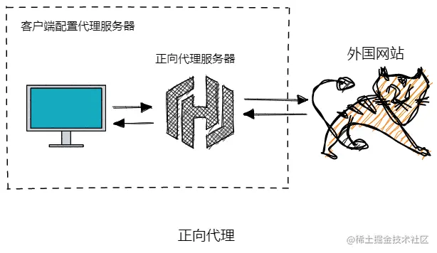 最常见的例子就是,我们访问一个外国网站,该网站无法在国内直接访问,但是可以通过代理服务器访问,也就是说,用户向正向代理服务器发送一个请求并指定目标,然后正向代理服务器向目标服务器(外国网站)转交请求并将获得的内容返回给用户。