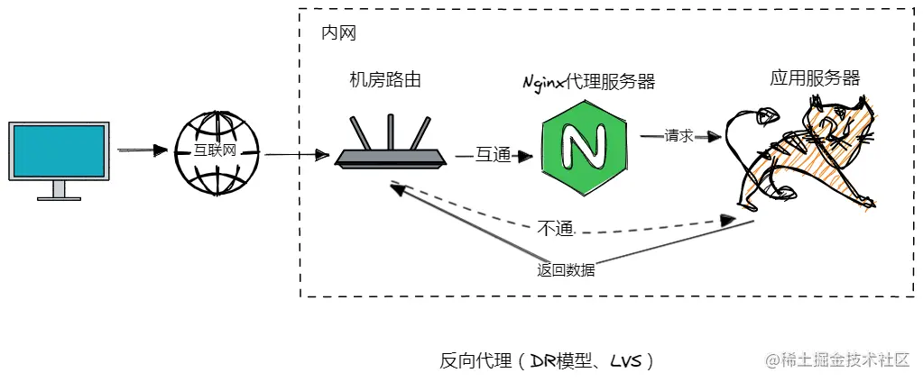 用户通过Nginx访问应用服务器,应用服务器直接将数据返回给机房路由,返回时不走Nginx了,降低了Nginx的性能消耗。