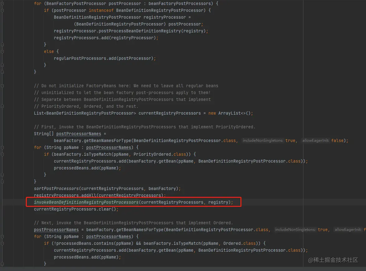 进入PostProcessorRegistrationDelegate的invokeBeanDefinitionRegistryPostProcessors方法 注意此方法执行后registry参数(BeanDefinitionRegistry)中的beanDefinitionMap会扫描到需要的bean信息 说明此方法才是真正起到扫描作用的地方 重点!!!