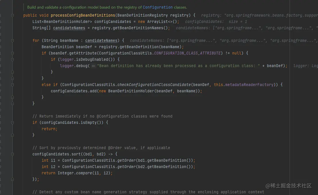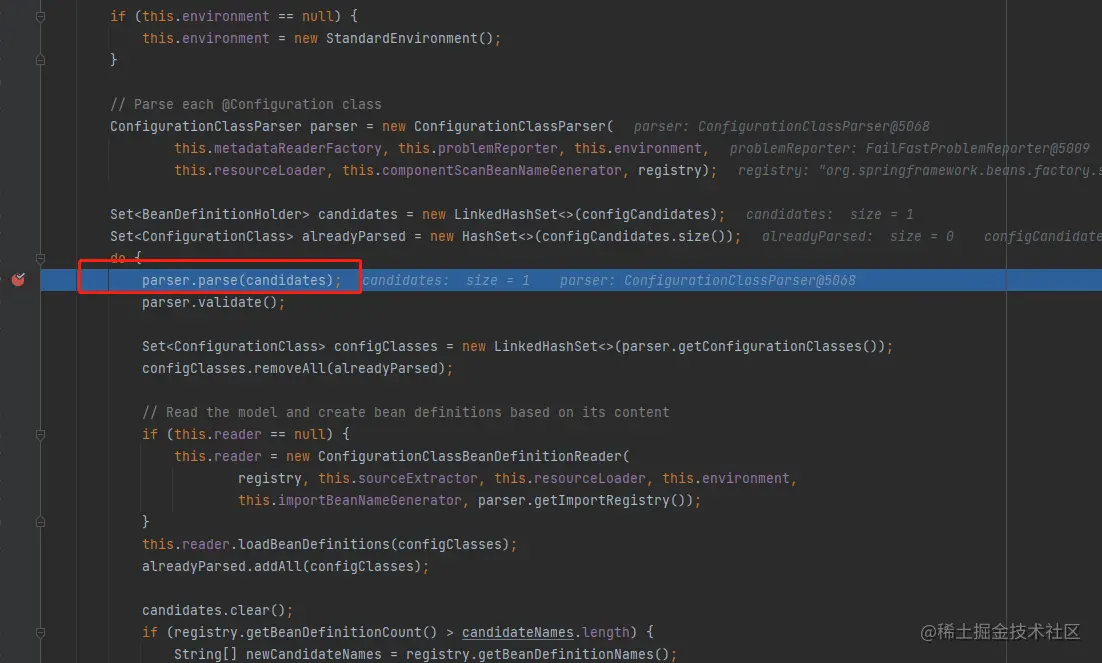 继续进 兄弟们 往里进 ConfigurationClassPostProcessor#processConfigBeanDefinitions 两张图都是此方法 ps:代码太长 其中的这个parser.parse()就是真正解析的方法