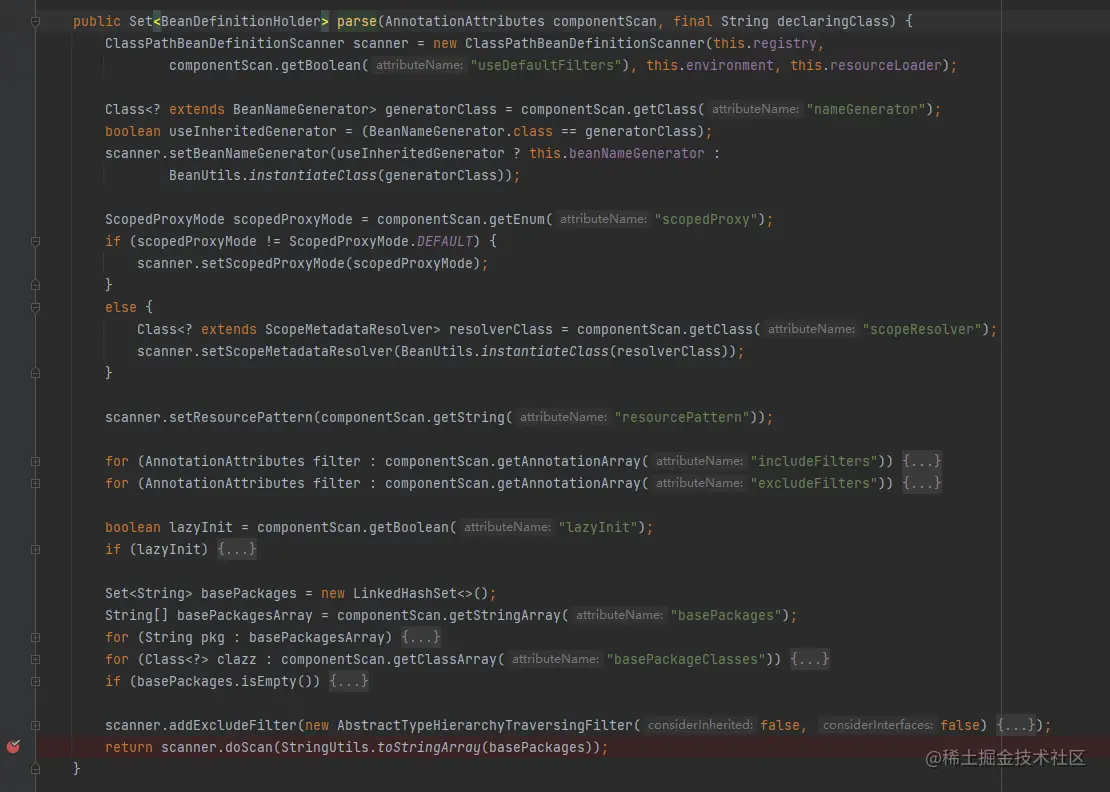 componentScanAnnotationParser#parse中的scanner.doScan(StringUtils.toStringArray(basePackages)) 这里说明一下这个basePackages由于我们没有指定 所以默认是启动类所在的包路径 ps:这也是需要将启动类放到最外层包的原因 放里面的话无法扫描到对应Bean