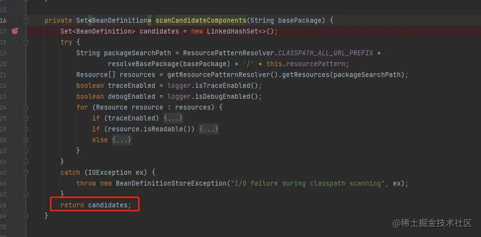ClassPathScanningCandidateComponentProvider#scanCandidateComponents 好了 到站 请各位乘客下车吧 这个方法就是真实找到底层bean的地方 原理很简单 参数basePackage为我们的包根路径 即启动类所在的路径 假设为com/juejin/drink 那么此方法会递归调用扫描com/juejin/drink下的所有类和目录 如果是需要注册的bean 那么放入new的LinkedHashSet中返回