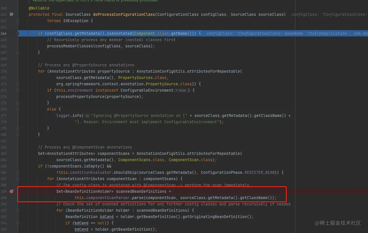 ConfigurationClassParser#doProcessConfigurationClass到了 很近了 你要问我 我只能说 快到顶了 仔细的同学应该已经看出来了 图上的这个Set会获取@ComponentScan类扫描注解 而这个入参即为我们的启动类Class 其中启动注解@SpringBootApplication中正包含了@CompentScan这个注解 所以此时这个Set中获取到了我们的启动类 红线标注的这个地方继续走哦