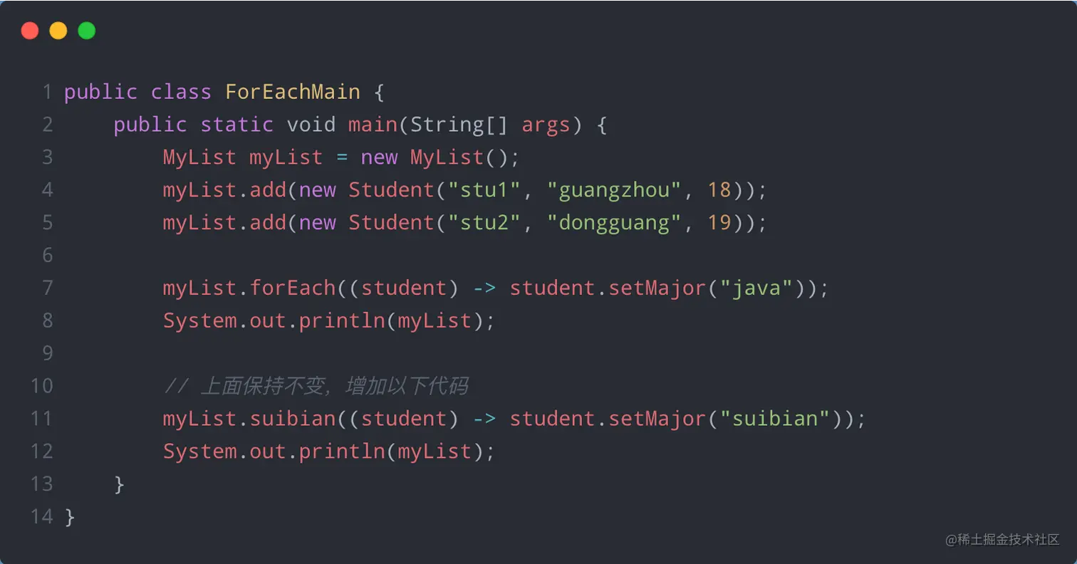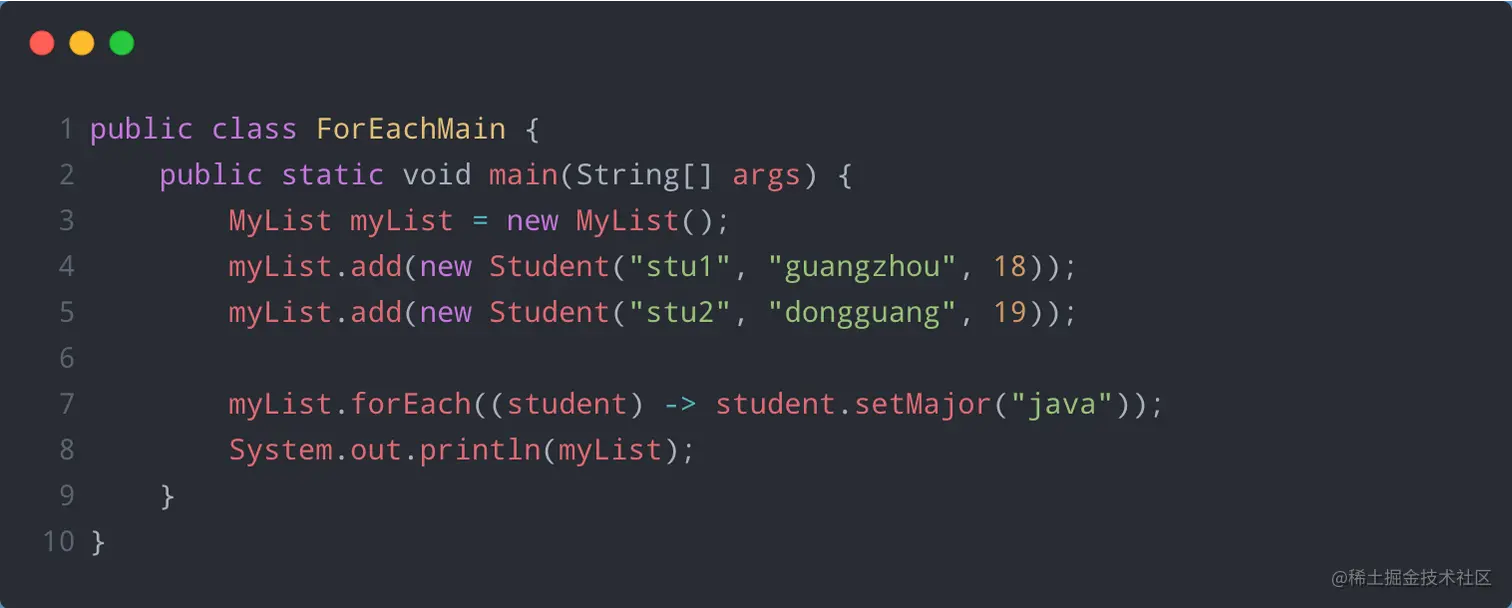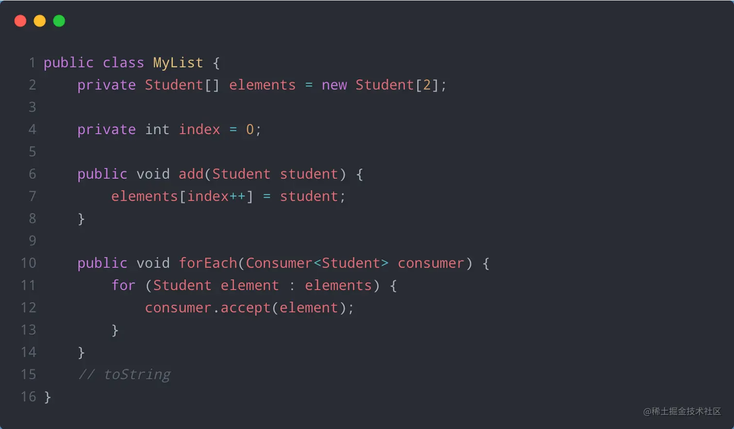 自定义一个list,里面有个Student数组存元素,还有一个add方法和forEach方法(使用Consumer)