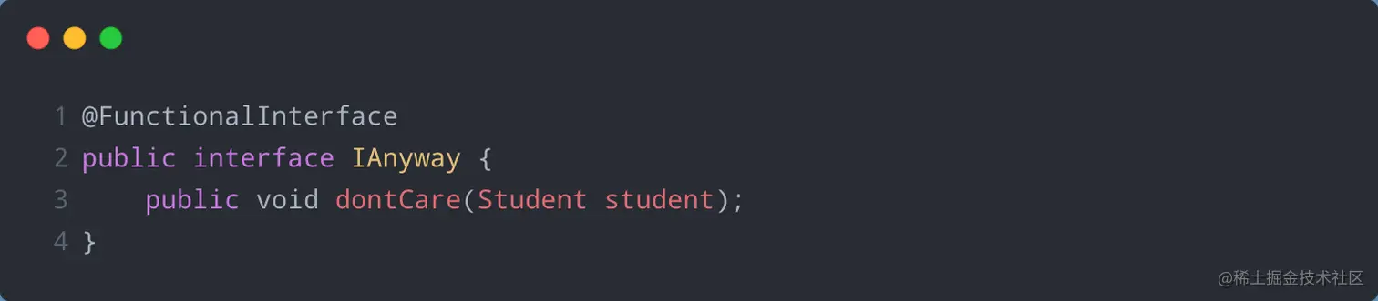 自定义一个函数式接口,本质上就是Consumer,然后类名和方法名改了一下,这样的目的是告诉新手同学jdk中的4大函数式接口不是什么神奇的东西,它们本质上就是接口,只不过是jdk总结了我们常用的场景来声明了这些函数式接口,避免了重复去声明一样作用的函数式接口。