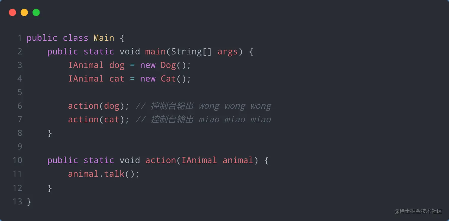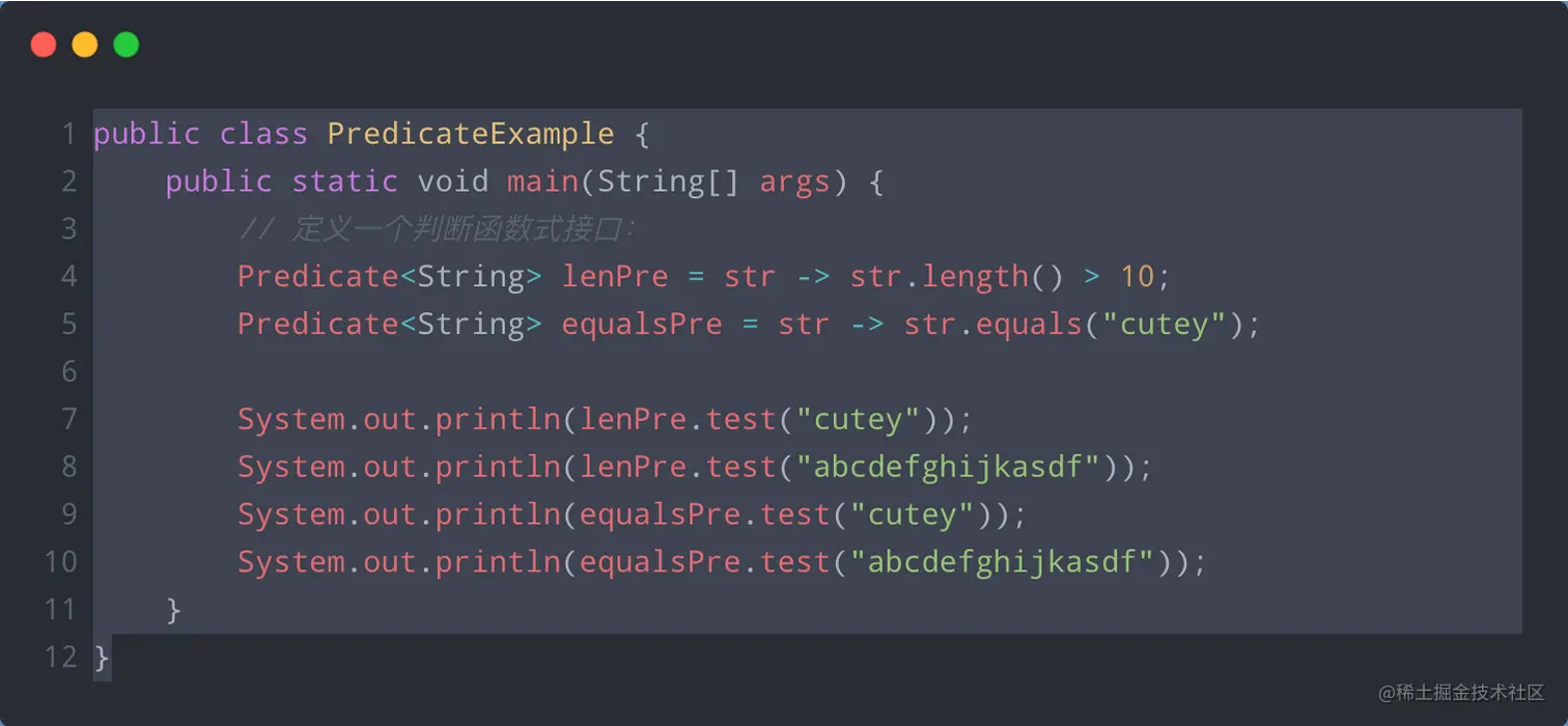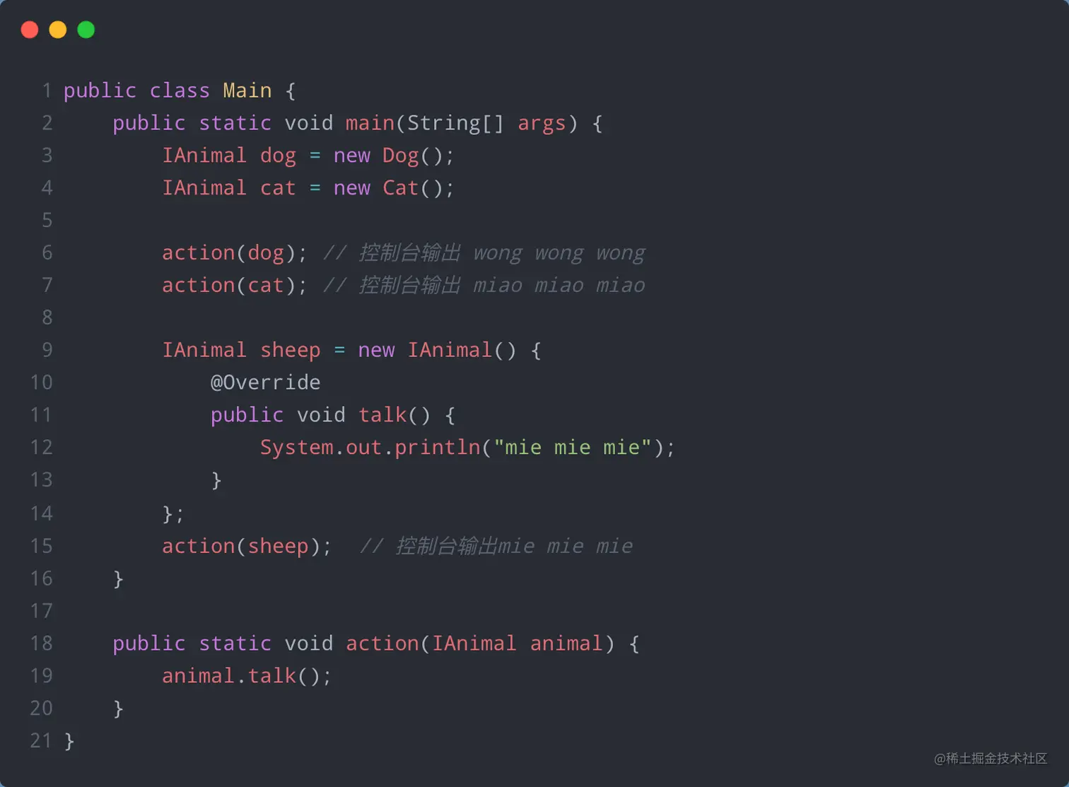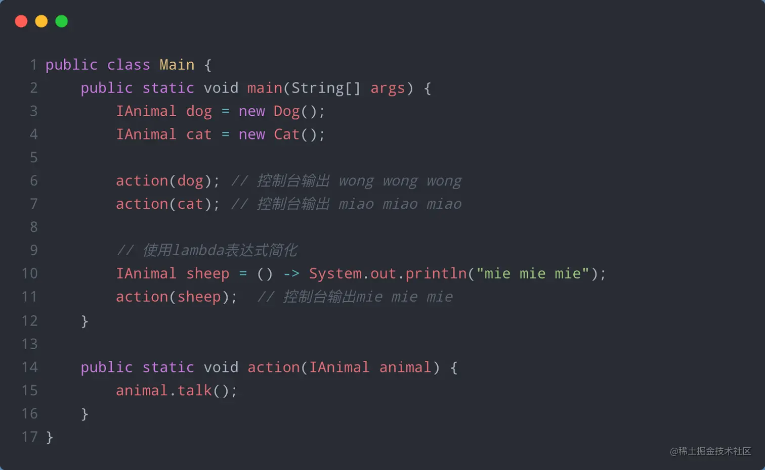 这样一简化后IAnimal就已经是一个函数接口了,而整个例子也就是自定义函数式接口,所以可以发现它的本质还是一个接口,只不过实现类从一个完整的类变成了通过函数去实现。