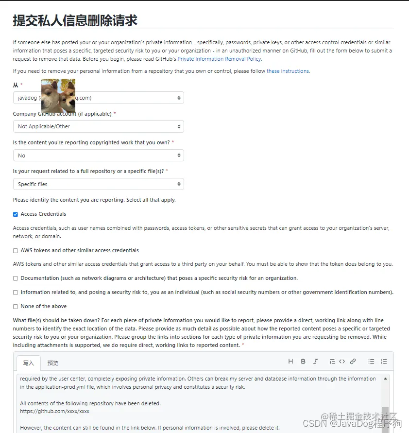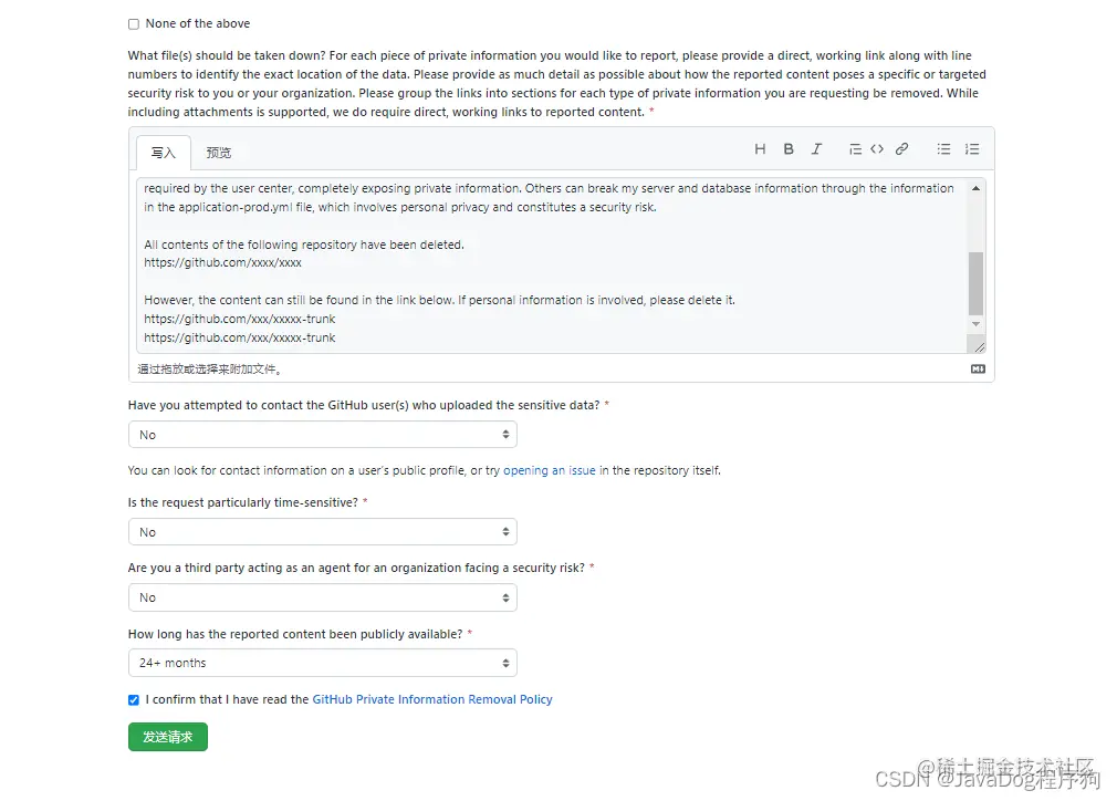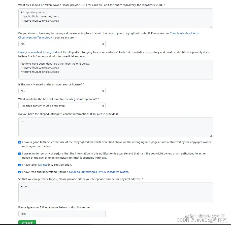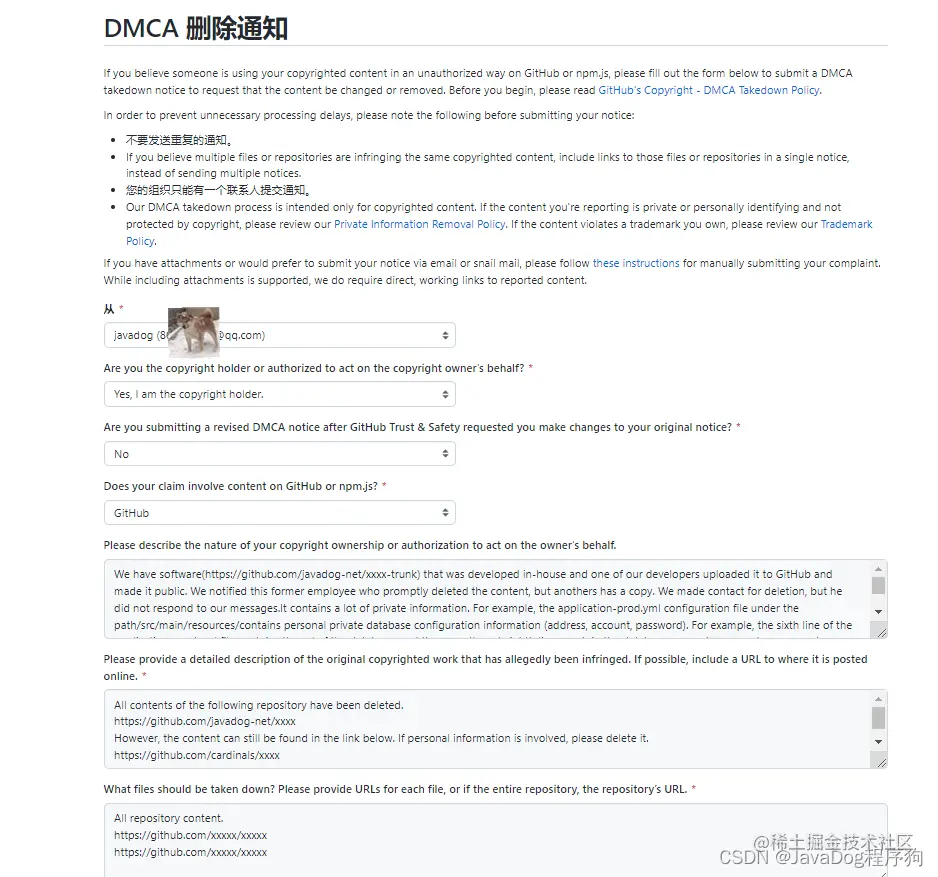 在一个月黑风高的夜晚,正准备休息的我突然接到之前外包老总的亲切问候。一顿输出才知道三年前为了搭建流程化部署,将公司的测试代码放到github上后忘记删除。现在被甲方的代码扫描机制扫到,并且检查到代码已经被其他用户fork,虽没有造成损失,但要求清除github所有数据及被fork的代码。以此为戒,特来跟大家分享一下处理流程,重点是GitHub的DMCA 下架通知提交指南。