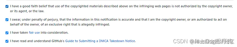 我真诚地相信,在侵权网页上使用上述受版权保护的材料未经版权所有者或其代理人或法律授权。我发誓,根据伪证处罚,本通知中的信息准确无误,并且我是涉嫌侵权的专有权的版权所有者,或被授权代表所有者行事。我已经考虑了合理使用。我已阅读并理解 GitHub 的提交 DMCA 删除通知指南。