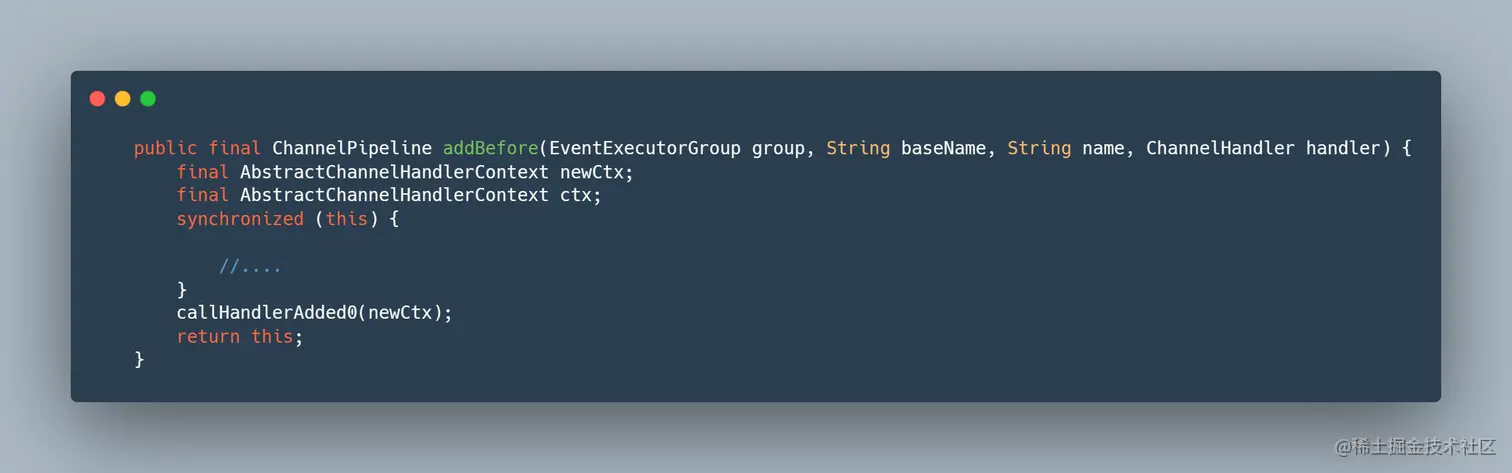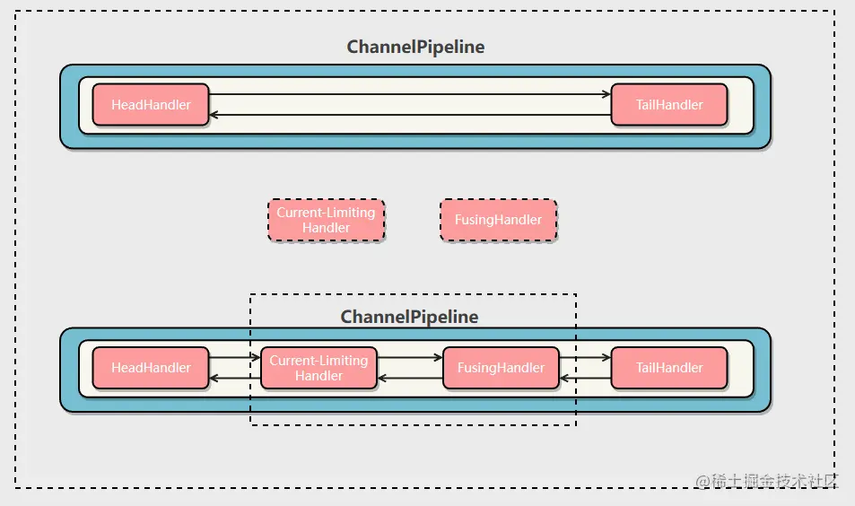 因此,我们可以在业务高峰期的时候,动态地将系统拥塞保护、或者是一些限流的ChannelHandler添加到当前的ChannelPipeline中。