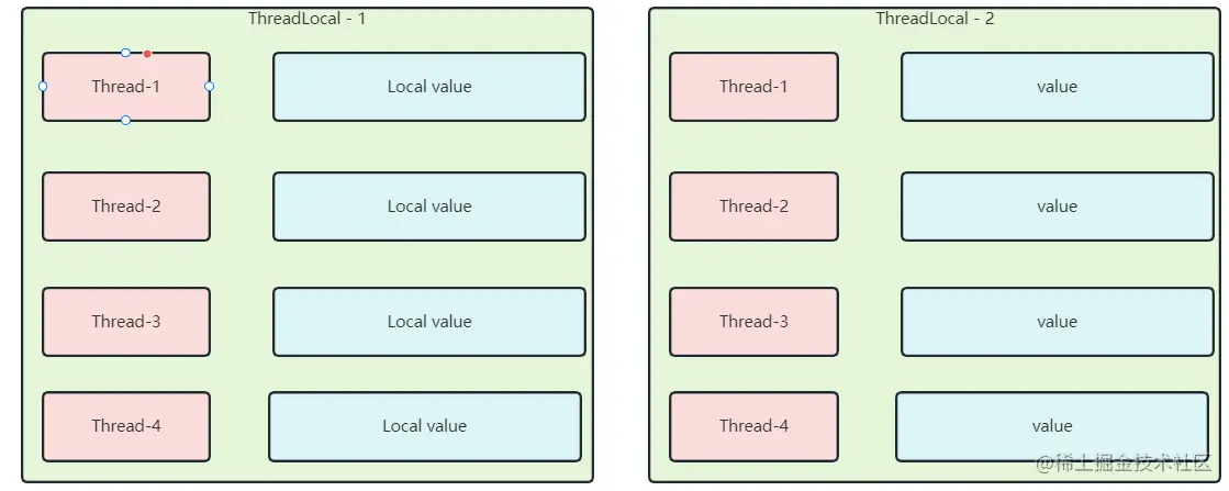 当工作线程 Thread 实例从 ThreadLocal 本地变量取值时,会以 Thread 实例为 Key,获取其绑定的 Value。
