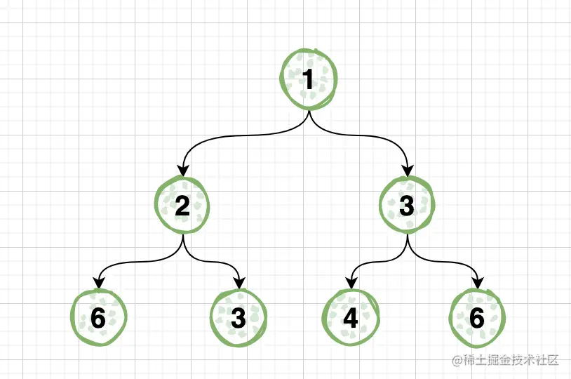 以6为根节点的完全二叉子树,这棵子树的最大值为6,和子树根节点一致。