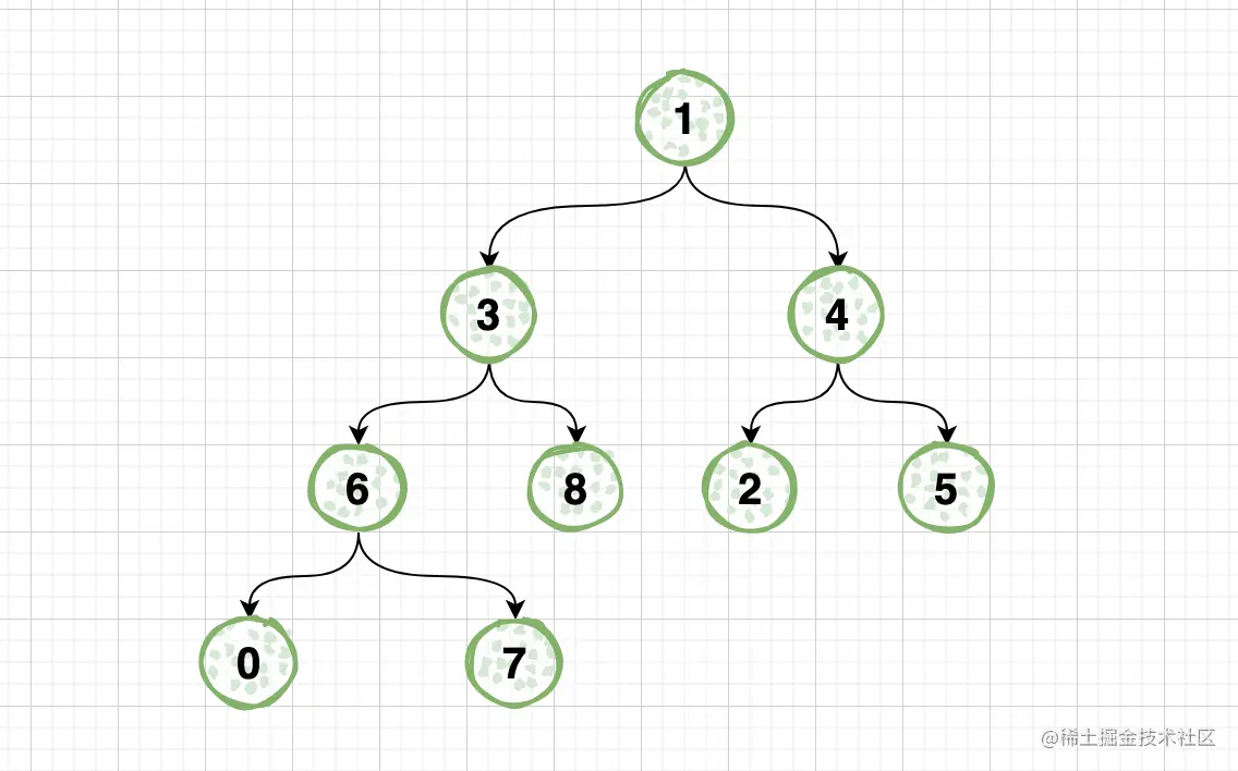 那如何用数组实现完全二叉树呢?数组的下标依次对应二叉树从上到下的节点。例如,数组为arr=[1,3,4,6,8,2,5,0,7],它对应的二叉树为如下图所示。