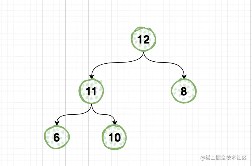 12,12比父节点6大,则6和12的位置进行交换,12继续和父节点10比较,比10大,继续交换,堆长度记为4。 - 加入元素