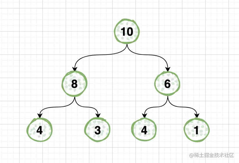 如下图所示,以10为根节点的完全二叉树,这棵树的最大值为10,和根节点一致。