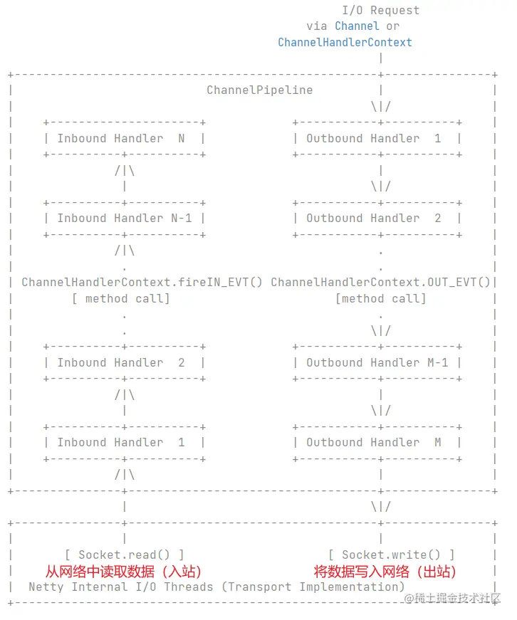 出站事件是从顶向下由出站处理器处理的,如右侧所示。出站处理器通常生成或转换出站流量,如写请求。如果出站事件超出了底部出站处理器,则会交由与Channel关联的I/O线程处理。I/O线程通常执行实际的输出操作,如SocketChannel.write(ByteBuffer)。