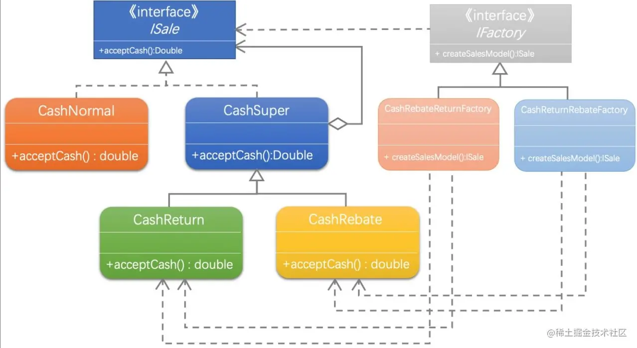 /** * @author Shier * CreateTime 2023/4/18 23:05 * 先打折再满减类 */ public class CashRebateReturnFactory implements IFactory { private double moneyRebate = 1d; private double moneyCondition = 0d; private double moneyReturn = 0d; public CashRebateReturnFactory(double moneyRebate,double moneyCondition,double moneyReturn){ this.moneyRebate=moneyRebate; this.moneyCondition=moneyCondition; this.moneyReturn=moneyReturn; } //先打x折,再满m返n public ISale createSalesModel(){ CashNormal cn = new CashNormal(); CashReturn cr1 = new CashReturn(this.moneyCondition,this.moneyReturn); CashRebate cr2 = new CashRebate(this.moneyRebate); cr1.decorate(cn); //用满m返n算法包装基本的原价算法 cr2.decorate(cr1); //打x折算法装饰满m返n算法 return cr2; //将包装好的算法组合返回 } } 复制代码/** * @author Shier * CreateTime 2023/4/18 23:05 * 先满减再打折类 */ public class CashReturnRebateFactory implements IFactory { private double moneyRebate = 1d; private double moneyCondition = 0d; private double moneyReturn = 0d; public CashReturnRebateFactory(double moneyRebate, double moneyCondition, double moneyReturn) { this.moneyRebate = moneyRebate; this.moneyCondition = moneyCondition; this.moneyReturn = moneyReturn; } //先满m返n,再打x折 public ISale createSalesModel() { CashNormal cn2 = new CashNormal(); CashRebate cr3 = new CashRebate(this.moneyRebate); CashReturn cr4 = new CashReturn(this.moneyCondition, this.moneyReturn); cr3.decorate(cn2); //用打x折算法包装基本的原价算法 cr4.decorate(cr3); //满m返n算法装饰打x折算法 return cr4; //将包装好的算法组合返回 } } 复制代码 -