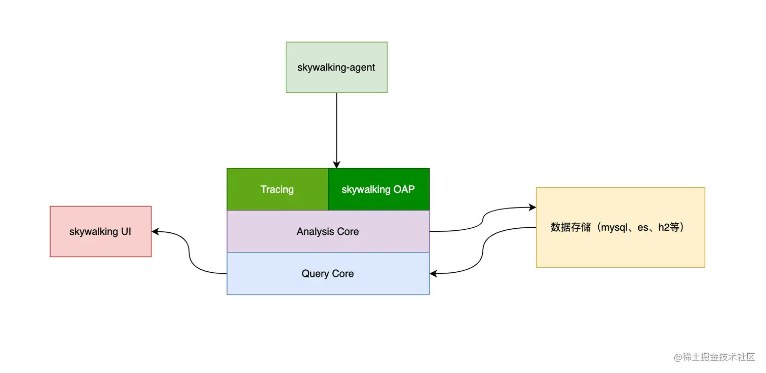 负责接收skywalking-agent发送过来的Tracing数据信息,Analysis Core对这些数据信息进行分析,把分析的数据存储到外部的存储器当中,Query Core提供查询数据的功能