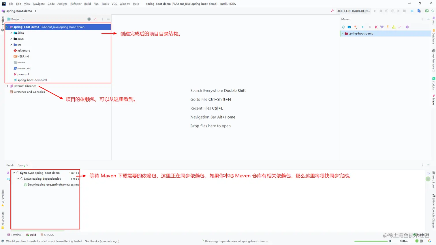 等待依赖包的下载以及同步,同步完成,一个 Spring Boot 项目就创建成功了。