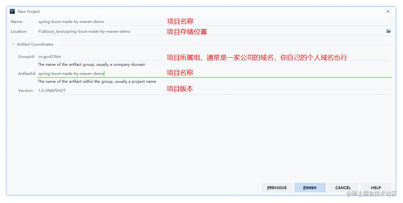 输入你的项目名称、存储位置、组等信息,搞定后点击 Finish 完成。