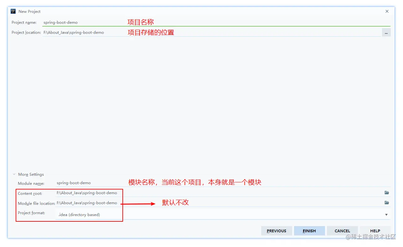 再次确认需要的项目名称,然后选择项目存储的位置,还可以进行更多的设置,包括模块名称,内容根目录,模块所在位置等信息,一般按默认的就可以了,点击 Finish 完成。如果选择的项目存储的目录不存在,则会提示你 IDEA 将进行创建这个目录。