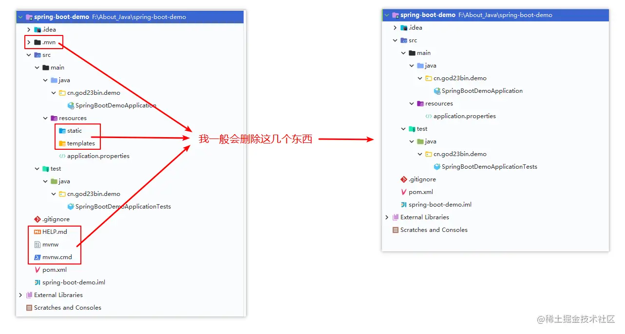 对于这个项目的目录结构,我一般会删除 .mvn、HELP.md、mvnw、mvnw.cmd 和 resources 目录下的 static 和 templates 目录。