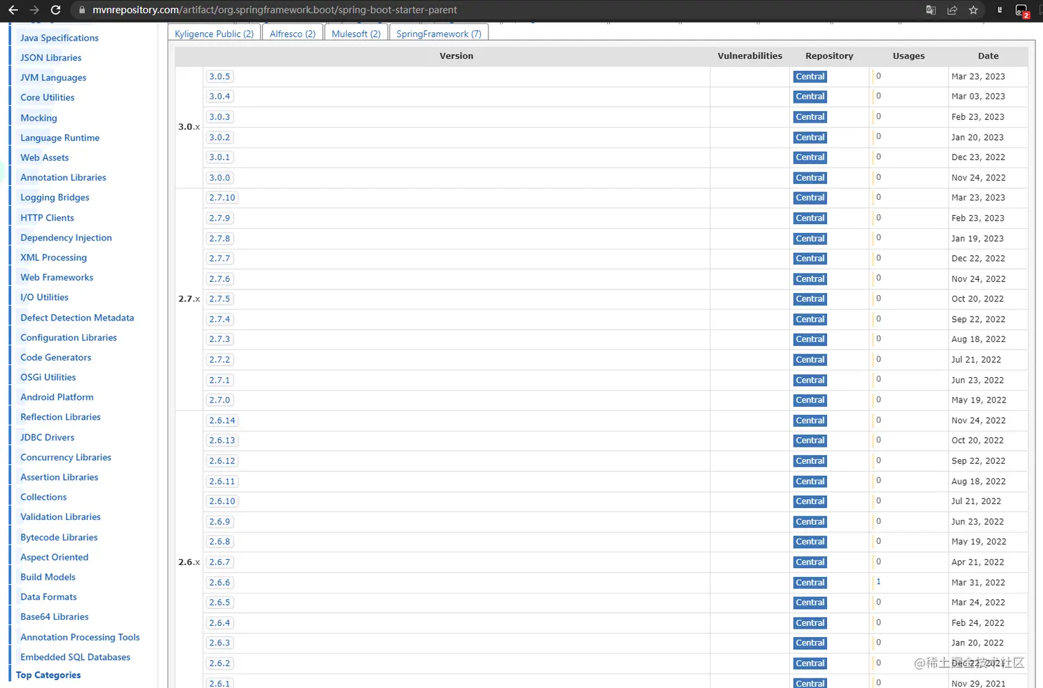 截至本篇文章书写时,Spring Boot 最新版本为 3.0.5,可自行在 Maven 仓库中查看:mvnrepository.com/artifact/or…
