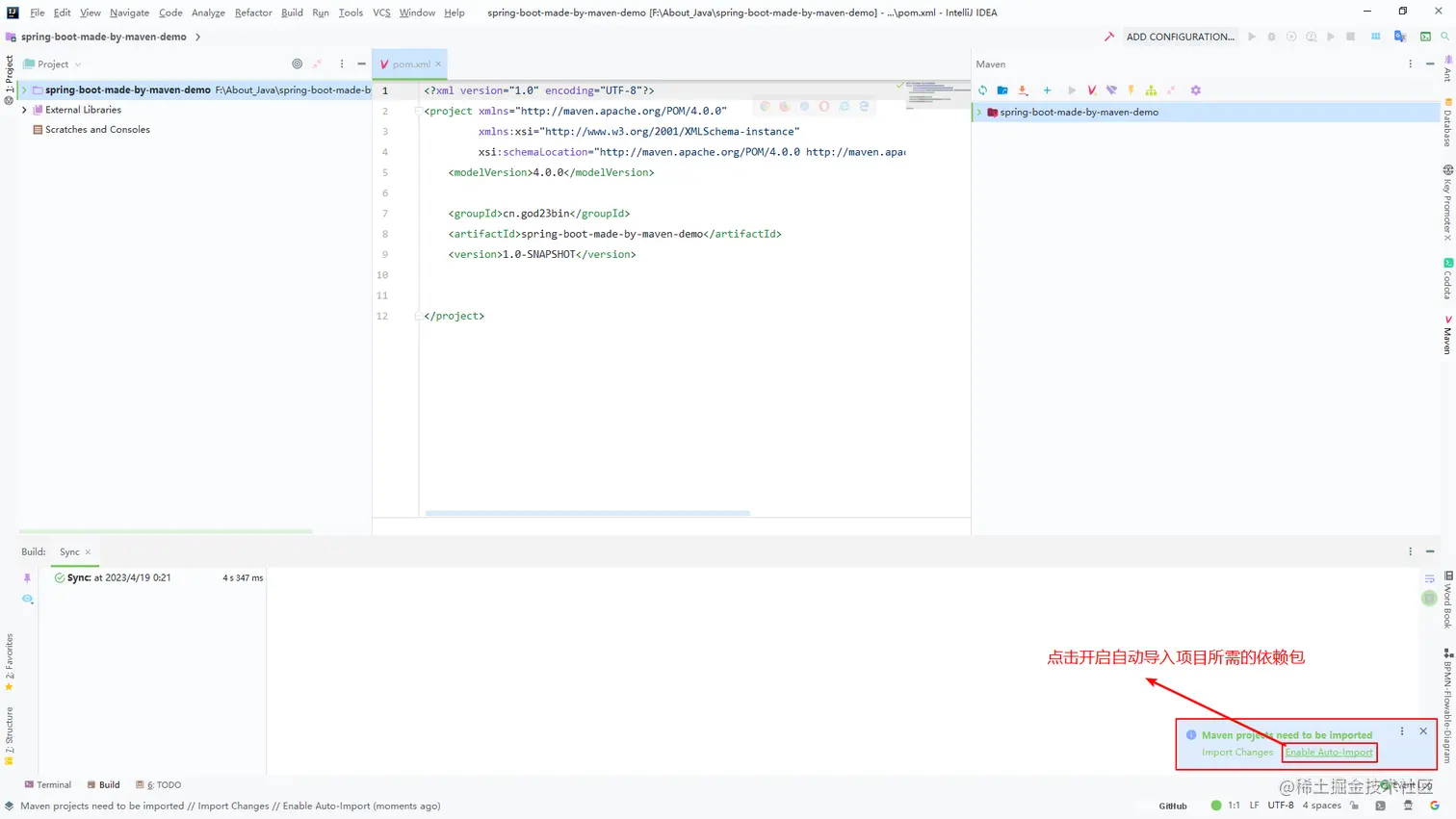 完成 Maven 项目的创建,接着点击 Enable Auto-Import,开启自动导入依赖功能。