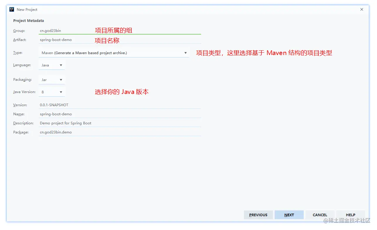 进行相关的项目元数据配置,比如项目组、项目名称、项目版本等等信息,搞定继续 Next。