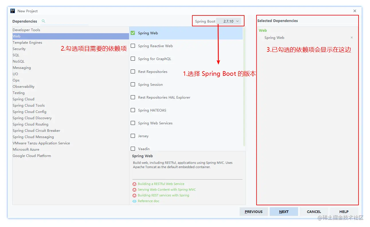 选择 Spring Boot 版本,勾选项目需要的依赖项,这里目前勾选需要的 Spring Web 依赖,搞定点击 Next 继续。