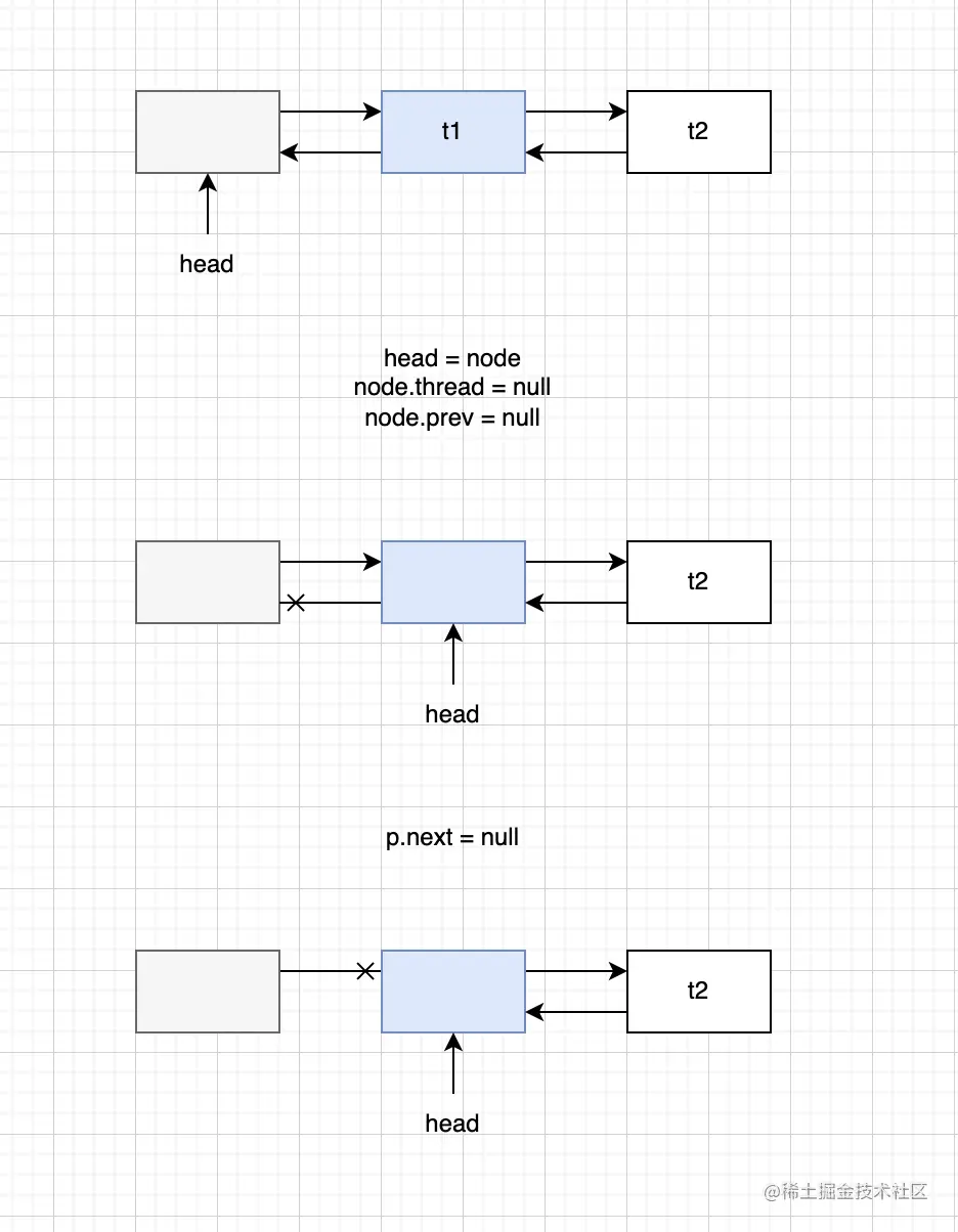 /** * Sets head of queue to be node, thus dequeuing. Called only by * acquire methods. Also nulls out unused fields for sake of GC * and to suppress unnecessary signals and traversals. * * @param node the node */ private void setHead(Node node) { head = node; // 将当前结点设置为头结点 node.thread = null; node.prev = null; }
